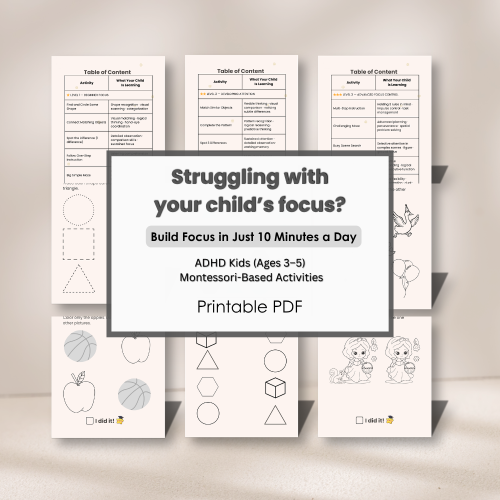 This premium focus and attention development bundle is specially created for preschool children, including those with ADHD learning needs. This printable PDF bundle offers structured practice through engaging, Montessori-inspired activities that build concentration, visual tracking, and task completion skills.