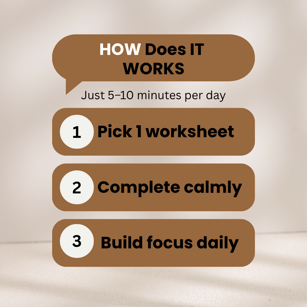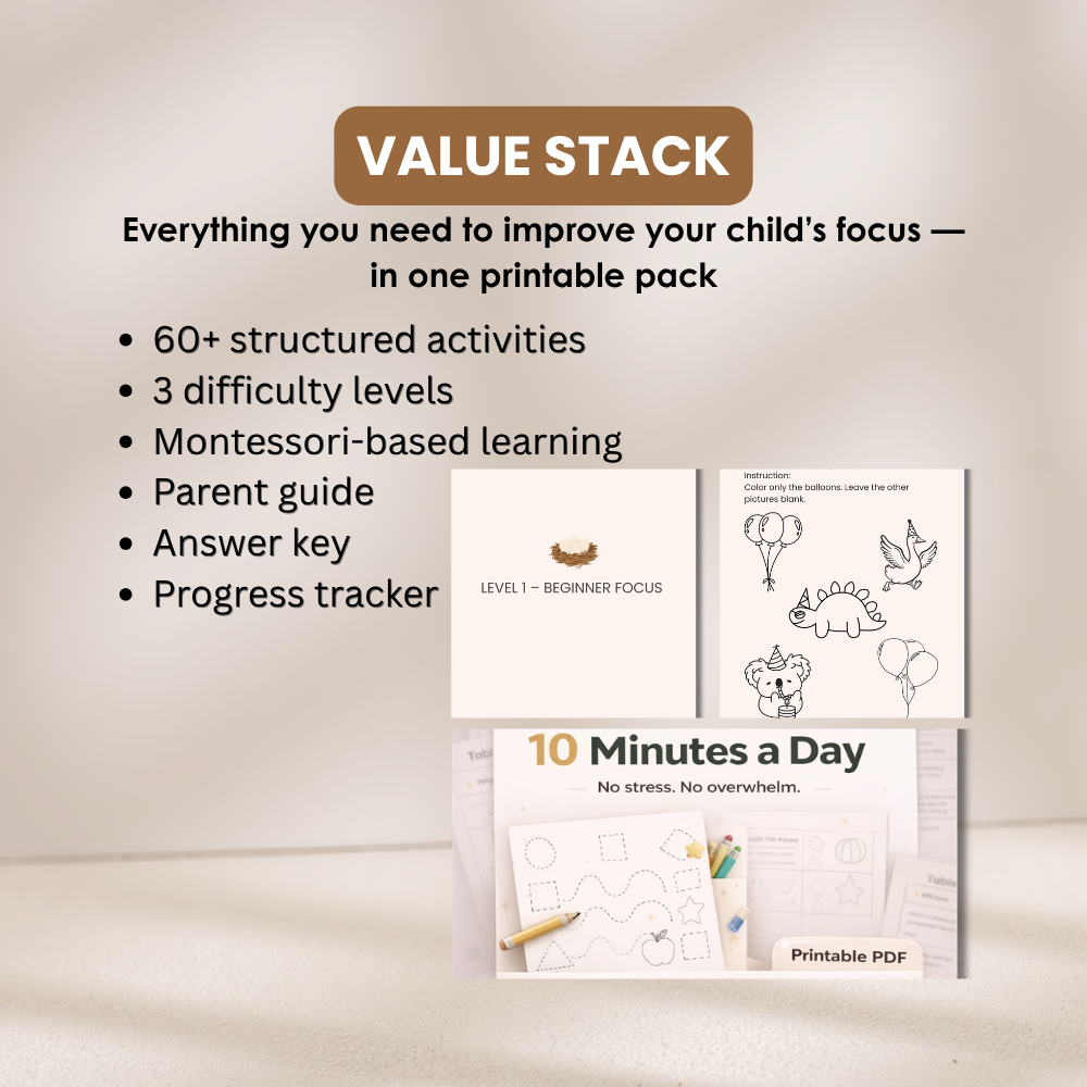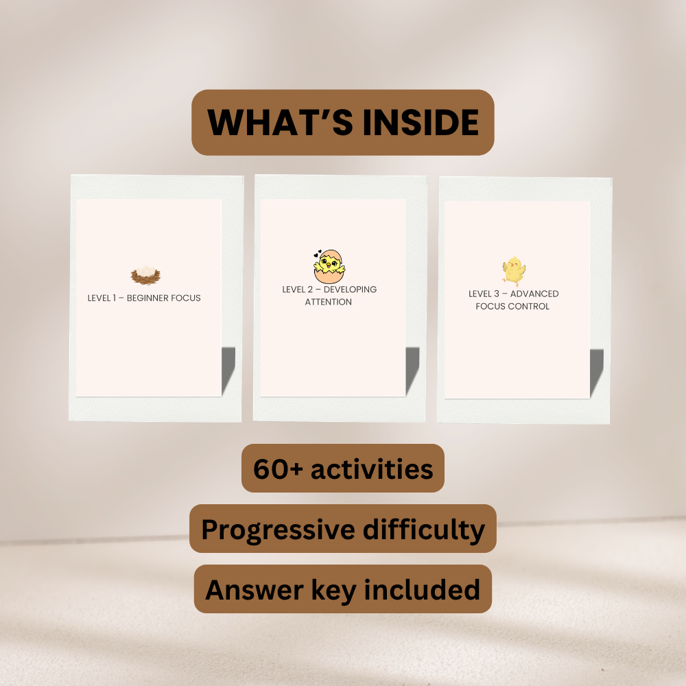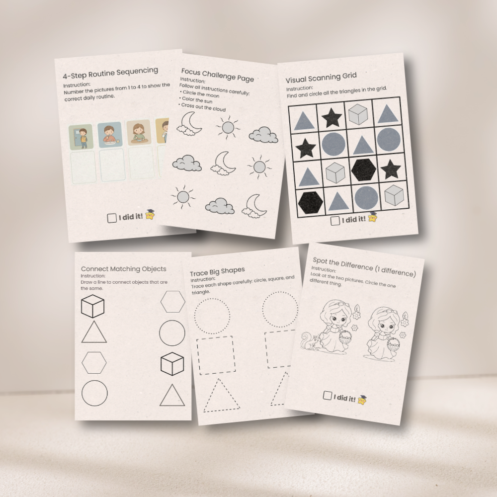 This bundle helps children develop sustained attention, improve focus control, and build confidence through short, structured activities. It’s ideal for parents, teachers, and therapists looking for effective early learning tools.